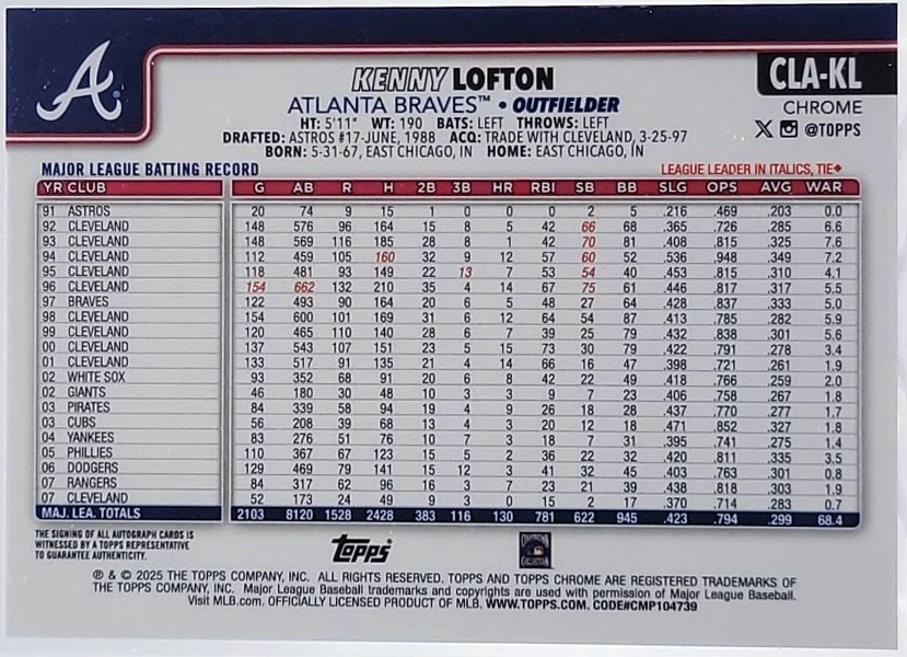 2025 Topps Chrome Update Legends Autographs Orange Refractors #CLAKL Kenny Lofton /25